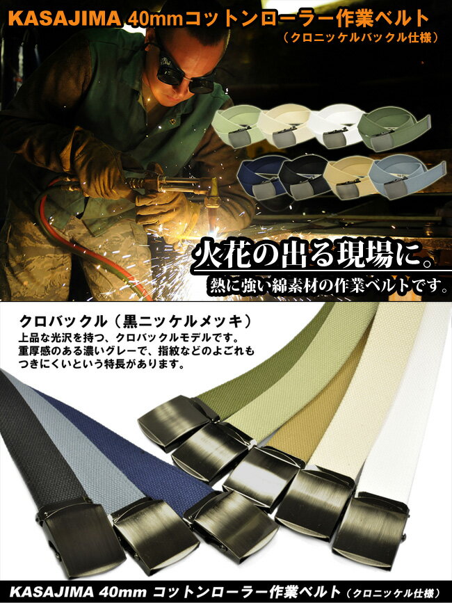 【ネコポスOK】作業ベルト 綿 40mm コットン GIローラー KASAJIMA No.10 LLサイズ | 日本製 全長140cm クロニッケルバックル 作業用 業務用 ワークベルト 作業服 作業ズボン 3.8センチ 38mm 4センチ 太 幅広 ガチャ ガチャベルト ローラーバックル 調節 調整