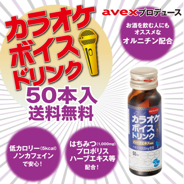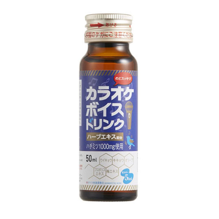 ■商品仕様■ 成分:エリスリトール / はちみつ/ リンゴ酢 / リンゴ果汁 / ハーブエキス / 梅エキス オルニチン / シトルリン / ウイキョウ抽出液 / キキョウ抽出液 / オリーブ葉抽出物 プロポリスエキス / 酸味料 / 香料 / カラメル色素 / 甘味料(ステビア) 50本入り(10本×5セット)カラオケボイスドリンク 50本入(10本×5セット)ボイスケア用品飲んだ瞬間にスーっと効果を実感!のどに爽快感があふれます。